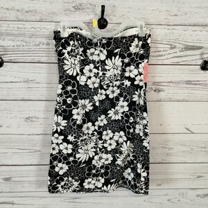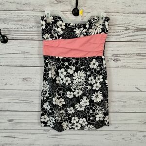 color: black and white floral design with pink waist line.