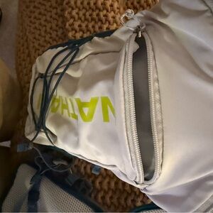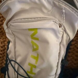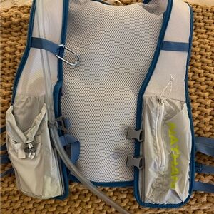 Nathan running hydration pack for long activities. Works perfectly and holds a lot of water easily. Has great pockets for cell phone and other accesories. Stretchy cord on back is great to hold a towel or running jacket or extra stuff like that. Backpack portion even has some carrying space outside the water flask for snacks or whatnot. Really useful!