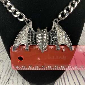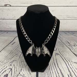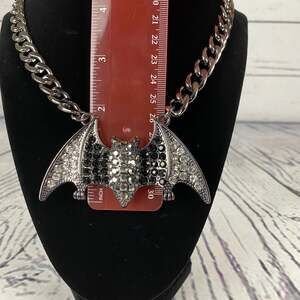 Stunning Natasha black bat rhinestone Halloween necklace. This necklace is a must have for Halloween lovers. It's beautiful in person and is a statement piece. Features a 3.25" wide bat and with gunmetal tone hardware that measures 10 inches long (not including the bat) with a 3 inch chain extender and lobster clasp closure.