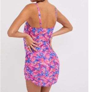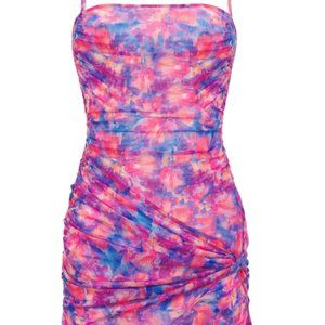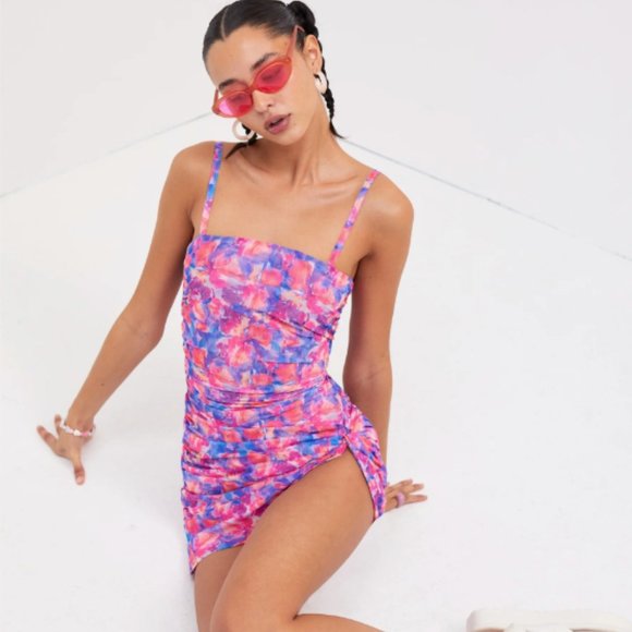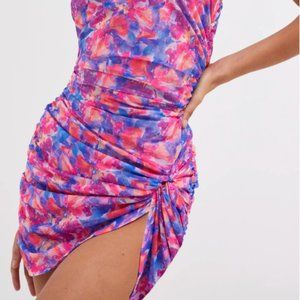 Vibrant 80s-inspired mesh cover up dress featuring shirring throughout dress and a twisted knot detail at skirt.