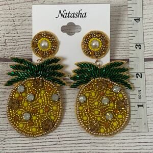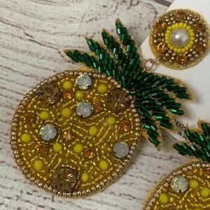 Beaded and jeweled pineapple dangle earrings with yellow felt backs. These earrings have post push backs. There are round medallion pieces that sit on the front of the posts and ear lobe with the leaves and body of the pineapple dangling. The beads are green for the leaves and a mixture of yellow, gold, brown, white orange, and taupe for the pineapple. They are NEW, never worn.