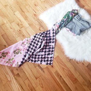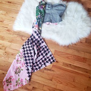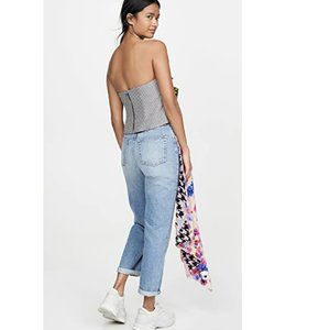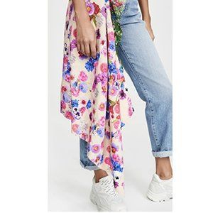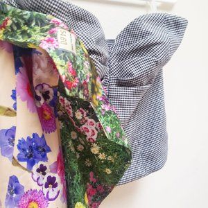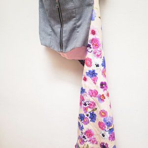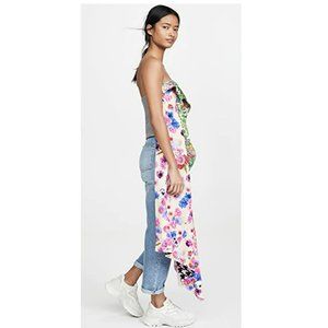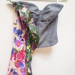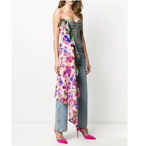 Natasha Zinko is coveted for her resourceful and innovative approach to creating pieces like this corset top. Multicolor silk and cotton floral draped detail bustier top from Natasha Zinko featuring a strapless design, a sweetheart neckline, a back zip fastening and a fitted silhouette. It’s crafted from a classic cotton herringbone with a cascading brightly colored silk attached silk scarf. An absolute showstopper!