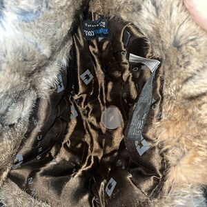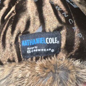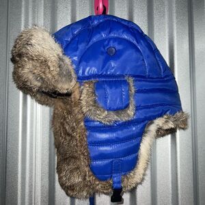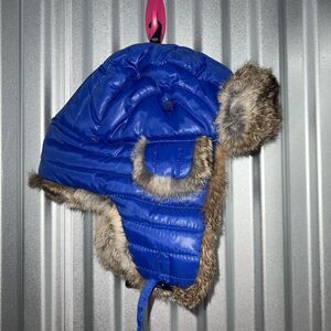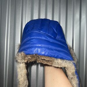 Nathaniel Cole Crown Cap Blue Puffer Trapper Hat Rabbit Fur Trimmed Winter