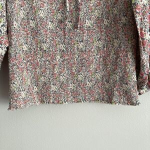 Nation LTD Abrielle Tee Superbloom Top Classic Boho Size Medium Pink Floral. Nation LTD womens blouse. Round neck with ruffle. 3/4 sleeves with elastic at ends. Smocked body. Open chest with tie at neck. 100% cotton. Pink floral ditsy print. Size medium. Measured laying flat: 13.5 inches from pit to pit with no stretch, 20.5 inches long from top tag to hem.