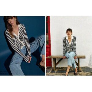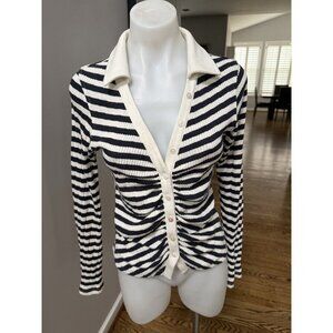 We have proof that a collared long-sleeve can still be sexy. This top features a center-front placket with a V-neckline and a little ruching at the buttons for added shape. (This one comes in Navy and White Pointelle Stripe.)
