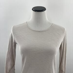 Soft cotton tee in a light sand color. The folded sleeves give this tee a unique look and fit. Scoop neckline with raw edge look. Just a perfect everyday long sleeve. Pima cotton. Machine wash. In preowned condition, has a small stain and a small hole.