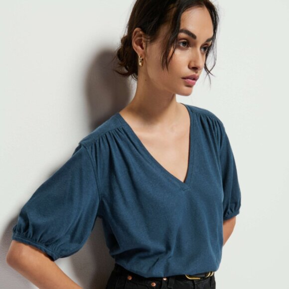 Nation LTD Edie Top Pima Cotton Hemp Bohemian Relaxed V-Neck Shirt Midnight Blue