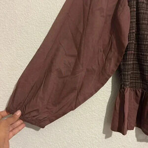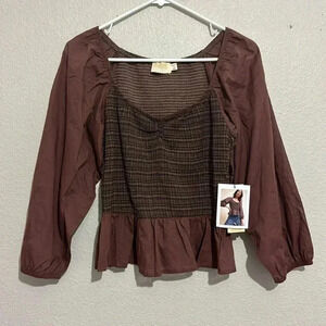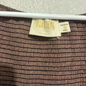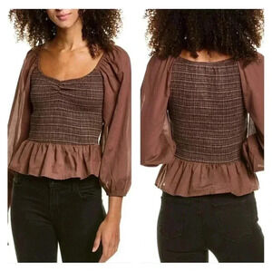 Nation LTD womens Tiana Combo Peplum Top, S, Brown About the brand: Beauty meets comfort in classic tees, tanks and relaxed staples. Tiana Combo Peplum Top in tartan with smocked bodice, elastic cuffs and peplum hem Approximately 21” Approx from shoulder to hem and pit to pit 15.5” Approx Measurements may vary slightly by size. 100% Pima cotton Machine wash Imported