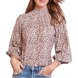 Nation LTD Melanie Leopard Print Pima Cotton Cream Brown Smocked Top Size XS