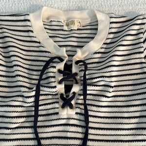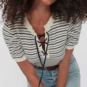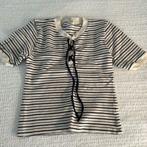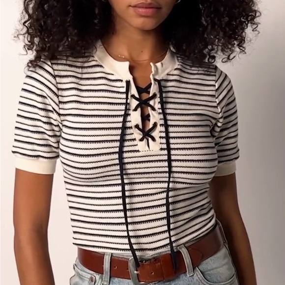 Short sleeve tee- lace up neckline. It can be laced tight or worn loose and open. Knit/sweater material. Great quality and on the thicker side. Never worn!