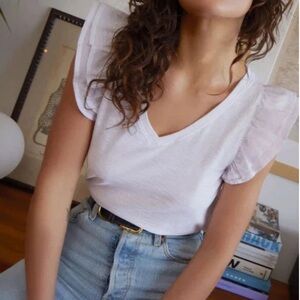 The Rylan Contrast Ruffle Tank is a flattering V-neck top with a double ruffle cap sleeve and an easy, contoured fit.