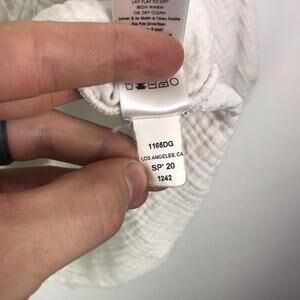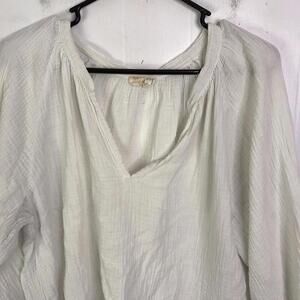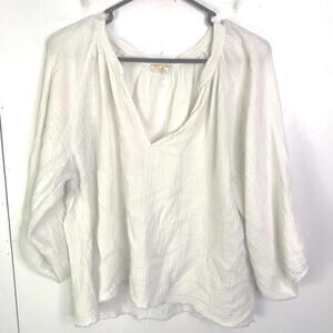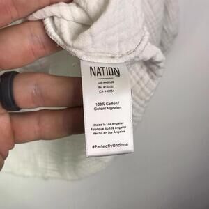 The Nation LTD Top Women's M Mimi Romance Textured Gauze Fringe Hem is a beige solid blouse with a V-neckline and 3/4 sleeves. Made of lightweight cotton material, this pullover top is perfect for casual occasions and features a fringe accent for added boho style. The regular fit and size make it suitable for a comfortable and relaxed look, ideal for the fall and spring seasons.