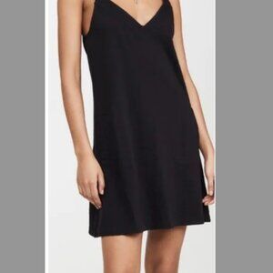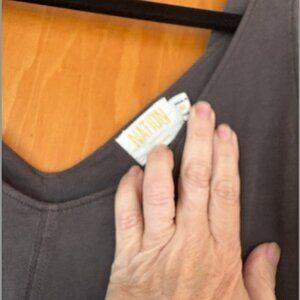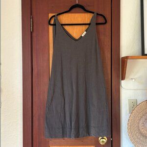 This casual gray mini sundress by Nation LTD features a sleeveless design with a chic V-neckline and tie straps. Its relaxed A-line silhouette ensures comfort and ease of movement. Perfect for casual outings, this minimalist dress offers a versatile style.
