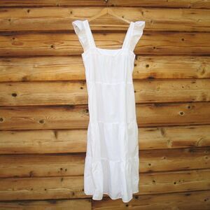 100% pima cotton. Made in Peru. Machine wash. Unlined. Pull-on styling. Flutter sleeves.Elastic back trim. Tiered poplin fabric with side seam pockets. Revolve Style No. NATI-WD201.