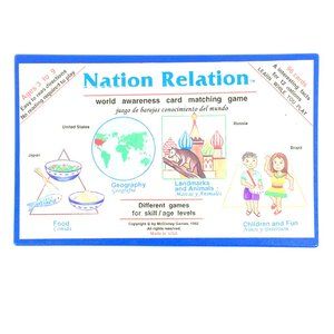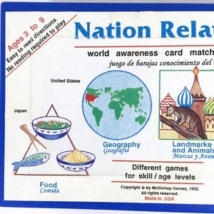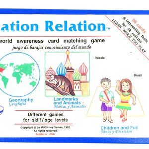 Nation Relation is a world awareness card matching game. The cards display children, landmarks, animals, foods, world location and flags for 12 nations. There are 4 different versions of game play which can be modified for different ages and playing levels.