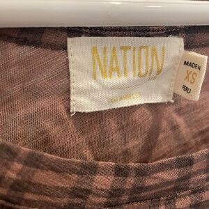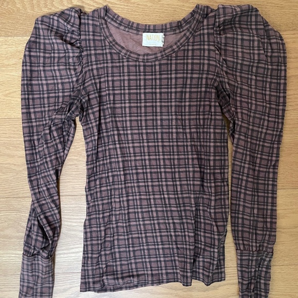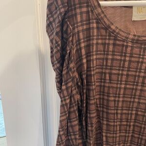 Lightweight shirt with brown and light brown plaid. Beautiful puffed shoulders with a trimmed down sleeve to the long cuff at bottom. Scooped neck and medium length. Casual yet dressy with details.