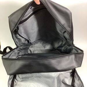 This backpack is in great condition! Its only flaw is the remnants of tape/sticker on the front. It is solid black but for the metal clasp in yellow. It has two main compartments, as well as mesh pockets on the side, a mesh sleeve inside with a zipper closure, and a small pocket in the back, between the straps.