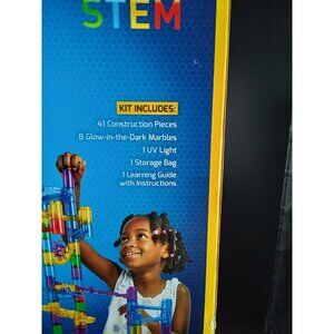 This National Geographic Glow-In-The-Dark Marble Run STEM Kit includes 50 pieces that enable the construction of a dynamic marble track. With glow-in-the-dark marbles, kids can build, create, and learn while experiencing the physics of motion and gravity. The kit includes construction pieces, eight glow-in-the-dark marbles, a UV light to activate their glow, and a learning guide complete with instructions. Designed to inspire curiosity in STEM subjects, this set promotes creativity and interactive play. The components include a storage bag, making cleanup and organization easy, and durable materials ensure lasting use.