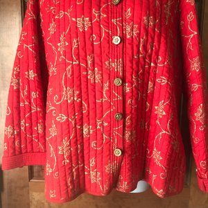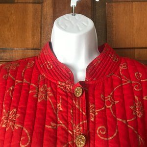 National Geographic by Pfeifer Studio; Quilted Jacket; Red with Gold Swirls; X-Large; Burnished Goldtone Buttons; Stand-Up Collar; Long Sleeves with Cuffs; Venter Straight Hem; Made in India; 100% Cotton; Hand Wash & Hang Dry; Armpit to Armpit 23"; Armpit to Hem 16"; Sleeve 17"; Length 27"