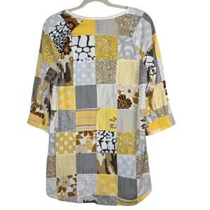 Style: Patchwork print shift/tunic-style dress with 3/4 sleeves and a scoop neckline featuring a front keyhole with single button closure.