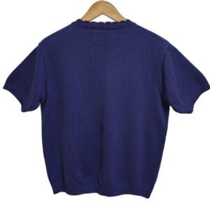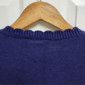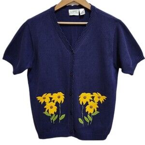 Vintage National Wildlife Federation Cardigan Sweater Womens L Navy Yellow Sunflowers Floral Scalloped Button Front Short Sleeve Grandmacore 80s 90s Retro