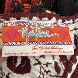 Fine Mexican Clothing label, intricate maroon embroidery on white lightweight fabric