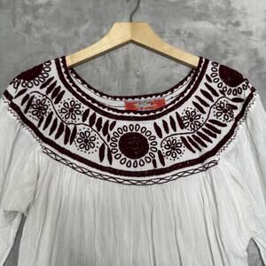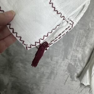 Nativa Tunic Top Womens Medium White Maroon Embroidered Boho Peasant Blouse Tassel