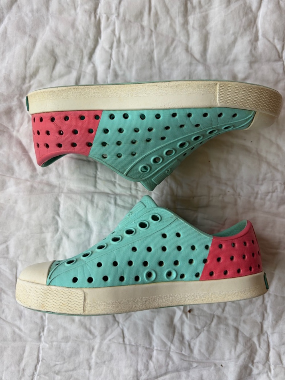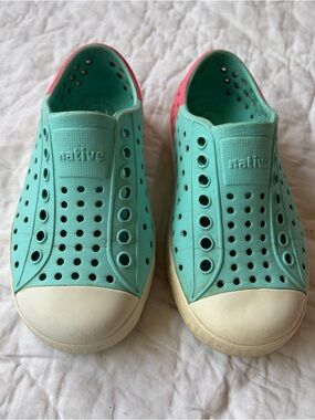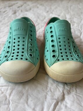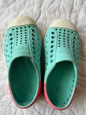 Unisex pink and blue native slip on shoes, perfect waterproof shoe for summer sandals. See listing photos for condition detail.