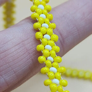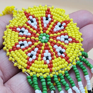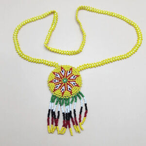 Native American Beaded Flower Necklace Leather Back Handmade Yellow Red Green