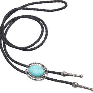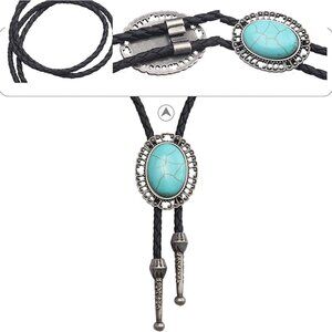 Cowboy bolo tie leather rope length is 39.4 inches with adjustable Initial turquoise Pendant and leather cord connected, you can wear it as a Indian knight bolo tie firm to your neck for wedding