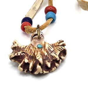 Native American Carved Eagle with Brass Beak Amulet Leather Cord Turquoise 30in