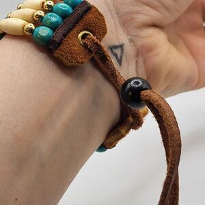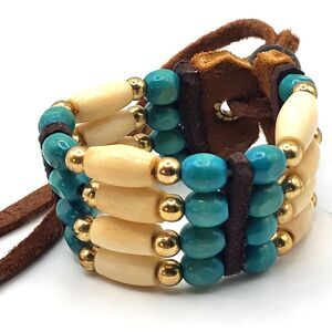 Native American Carved Horn Bovine Brass Wood Leather Bracelet 10in | Materials: leather, wood, carved horn bone, brass | Length: 10in | Clasp: bead slide | Signed? no | Excellent vintage condition
