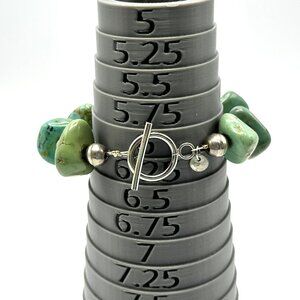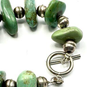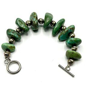 This chonky bracelet showcases the natural beauty of Southwestern turquoise in colors ranging from deep forest green to vibrant blue-green. The stones display characteristic brown matrix webbing and natural color variations of the Royston-district Nevada turquoise—prized for its rich green hues and distinctive golden-brown matrix patterns.Twelve genuine turquoise nuggets are separated by sterling silver spacer beads and secured with a toggle clasp. At 52 grams, this piece has real presence.