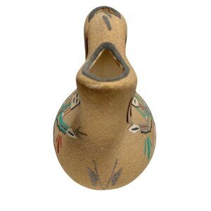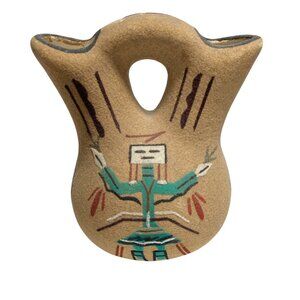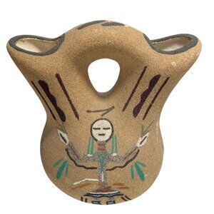 This image displays a Native American wedding vase, specifically a style often associated with the Navajo or Pueblo tribes. This particular vase also features sand painting, a traditional art form where designs are created using naturally colored sand, minerals, or pigments