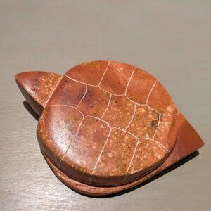 Native American Pipestone Turtle Effigy or Fetish. Hand-carved pipestone. Indian made pipestone craft. Measures 4 1/8" L x 3 1/4" W. Weighs 7.7oz. Has original tags. Please see pics for further description, condition, and coloring.