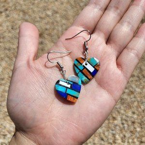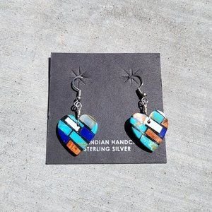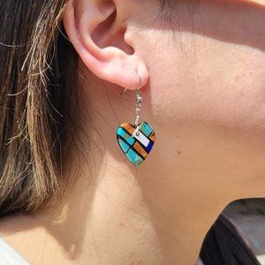 Native American Jewelry Zuni Heart Shaped Multi Stone Inlay Dangle Earrings