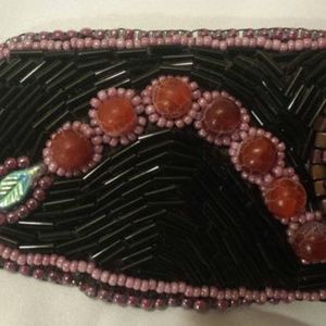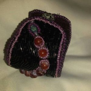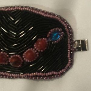 Elegant Purple Labradorite cabochon cuff bracelet with cracked agate beads surrounded by black bugle beads. Aprrox. 7" long. with a silver box clasp. ONe of a Kind, hand made by Native American, me! Making bead embroidered jewelry is one of my passions!
