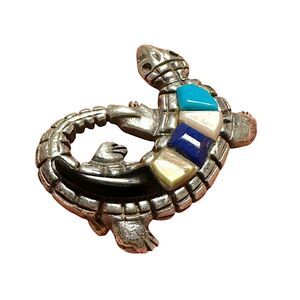 Native American Lizard Pendant Brooch Multi Stone Inlay Sterling Turquoise