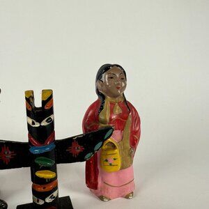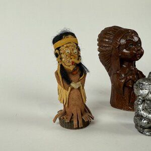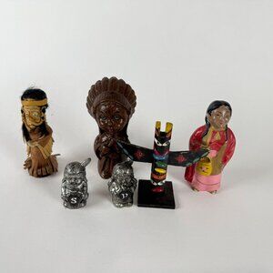 This charming lot of 6 vintage cultural figurines includes a mix of handcrafted folk art pieces and novelty collectibles. Features include Native American-style carvings, a colorful totem pole, and salt and pepper shakers. Materials range from carved wood and painted ceramic to metal and leather. These figurines are perfect for display, collectors of ethnic art, or anyone interested in global folk culture. A fun and diverse set for vintage décor or gift giving!