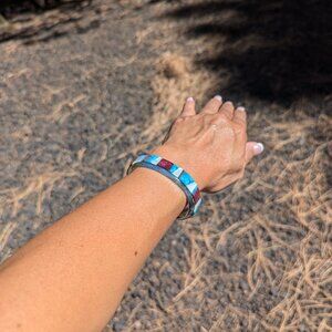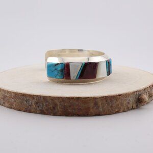 Discover the Timeless Elegance of our Native American Multi Stone Cuff Bracelet. Made with Turquoise, white Mother of Pearl, and purple Spiny Oyster.