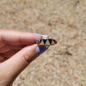A beautiful hand made Native American jewelry. Sterling Silver ring inlaid made with turquoise, jet, coral, and mother of pearl. Traditional tribal design. A Southwestern Collectible Jewelry. This piece was handmade and signed by a Zuni artist Cena Hernandez, a member of the Zuni Tribe.