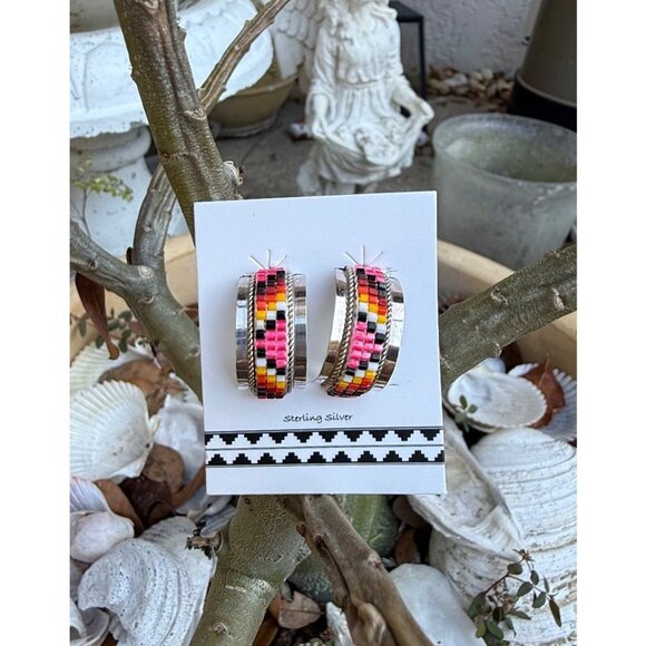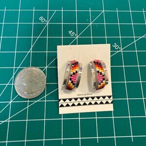 Native American Navajo Handmade Beaded Hoop Sterling Silver Earrings LR New gift