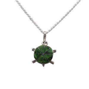 Elevate your style with this exquisite Native American Turtle Necklace. Handcrafted with precision, this stunning ensemble embodies the rich traditions of Southwestern jewelry. Zuni turtle design with serpentine. Signed by the Zuni artisan Johnson Laweka.