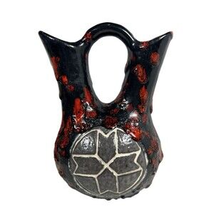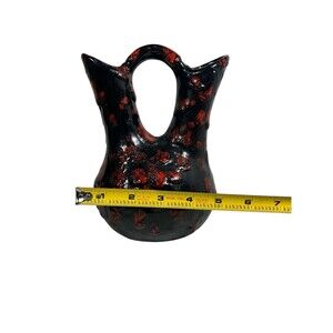 This exquisite Native American Pueblo Pottery Wedding Vase is a stunning piece of art that showcases the rich culture and heritage of the Native American people. The vase is made of high-quality black and red clay, and it has been signed by the artist, adding to its authenticity and value. The vase measures 7.5 inches in height, and it has been carefully handcrafted with great attention to detail, making it a unique and cherished addition to any collection. Wedding vase is in very good pre-loved condition. Some light surface wear, if any, and possible light scratches from use as to be expected. No chips or cracks. Please see additional pics. Anything that is used to display the above items (ex: ruler, pedestal. easel, etc) is not included in the sale. IMAGES CAN SHOW DIFFERENT COLOR DEPENDING ON THE FLASH or ROOM LIGHT.