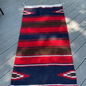 Native American rug with red, blue, brown, and white stripes aztec. Perfect for adding color to any room. ❣️