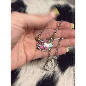 Native American SW Sterling Silver &💙💗 Cotton Candy Turquoise Oval Bar Necklace