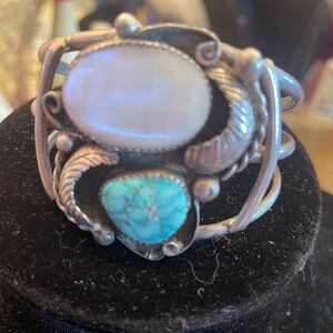 Native American Signed Sterling Silver Turquoise and White Stone Cuff Bracelet