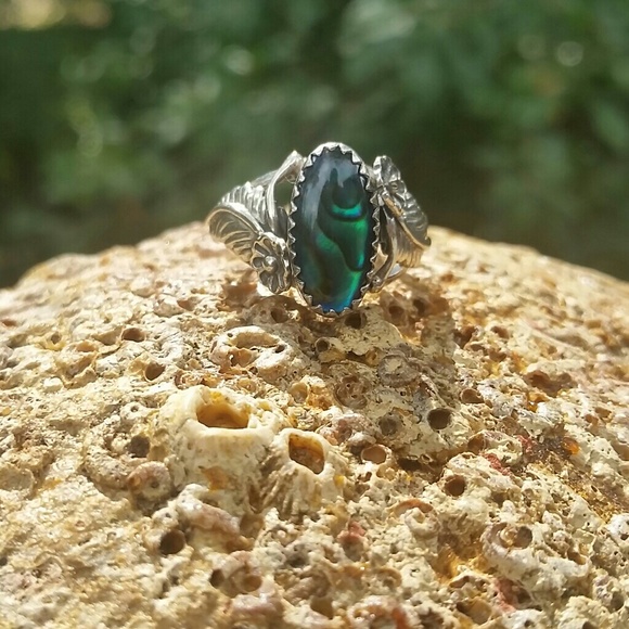 This beautiful vintage ring will brighten your day! It is unmarked and unstamped but tests for sterling silver. It features a beautiful abalone or paua shell stone surrounded by a traditional Navajo sawtooth bezel and squash blossom flowers. Size 5.