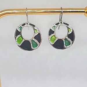 Native American Silver, Green Stained Glass and Jet Black Enamel Dangle Earrings