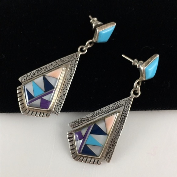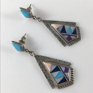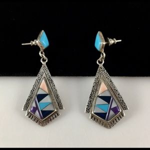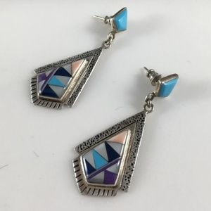 Native American sterling silver with turquoise and other inlay stones southwestern pierced earrings.